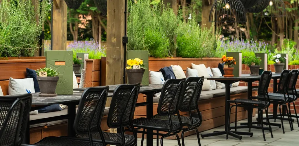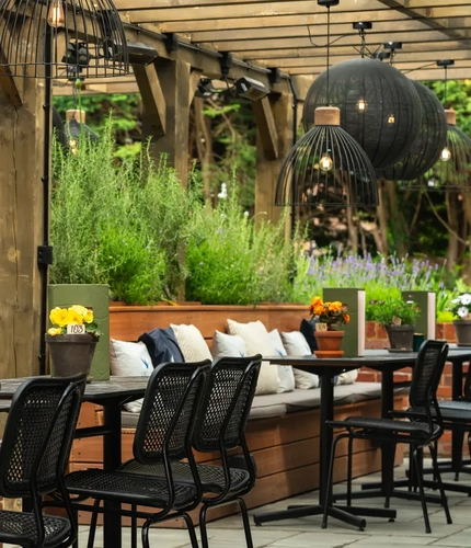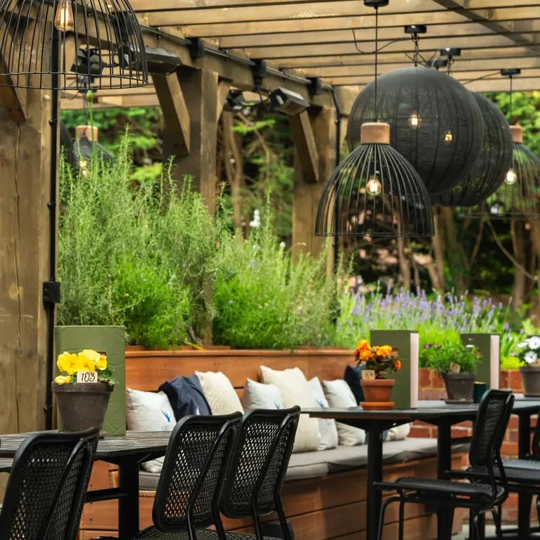 Step into our inviting beer garden, where outdoor comfort meets seasonal delight. Designed to be enjoyed all year round thanks to its wooden pergolas covered in twinkling fairy lights, cosy firepits promising warmth and relaxation even on the chilliest evenings, and spacious open terraces. The perfect spot to savour the seasons.